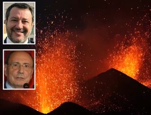 Nei riquadri, accanto all’eruzione di un vulcano, i protagonisti dell’ultimo scontro in ordine di tempo: in alto, il ministro (leghista) Matteo Salvini, in basso il presidente (forzista) della Regione Siciliana, Renato Schifani