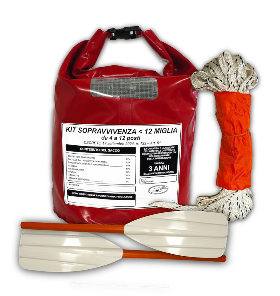 Il kit di sopravvivenza al posto della zattera costiera per i gommoni entro il 12 miglia è abbastanza impegnativo e costoso (intorno ai 250 euro). Comprende: soffietto o pompa di gonfiaggio, due pagaie (esterne al kit) coltello a lama fissa galleggiante, torcia elettrica con le sue batterie in confezione stagna separata, sassola, due spugne, fischietto, kit di riparazione (toppe e mastice), 24 contenitori d’acqua potabile da 1/4 di litro ciascuno. Il kit è sigillato, non può essere aperto se non nell’emergenza, e dura 3 anni. Dubbio: la sassola su un gommone è ridicola, meglio una pompa di esaurimento a mano, con il pescante che arriva anche in sentina. Il kit di riparazione va bene a terra, ma in mare, in emergenza, toppe e colla servono a poco: sfido chiunque a piazzare le toppe con il gommone che salta, il tessuto si sgonfia, la colla non fa presa istantanea…
