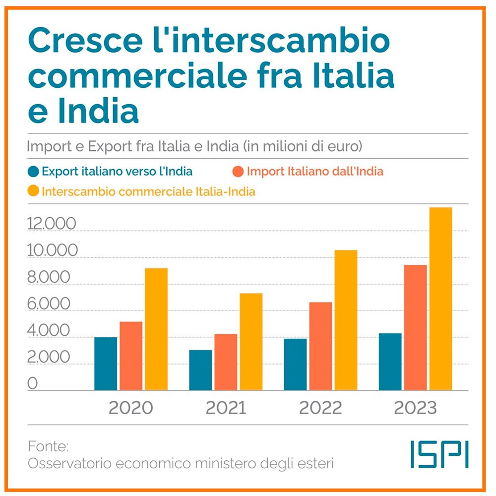 L’Ispi, l’istituto che si occupa di politica internazionale, in un dossier del 2023 indicava in «un ponte per le startup e una rinnovata cooperazione nei settori della difesa e delle energie rinnovabili» il frutto economico dell’intesa che la presidente del consiglio Giorgia Meloni ha raggiunto con il primo ministro indiano Narendra Modi: un balzo in avanti nei rapporti fra le due economie, visto che la premier italiana – riporta l’Ispi – già dal suo debutto sulla scena internazionale «ha deciso di elevare a “partenariato strategico”, sigillato anche dall’adesione dell’Italia alla “Indo-Pacific Oceans Initiative”, piattaforma di cooperazione per la sicurezza nell’Indo-Pacifico promossa dal governo indiano». Se pensiamo che nella prima metà del decennio scorso Italia e India se l’erano dette di tutti i colori per la vicenda dei due fucilieri della Marina Militare arrestati dalla polizia indiana per aver sparato a pescatori indiani…