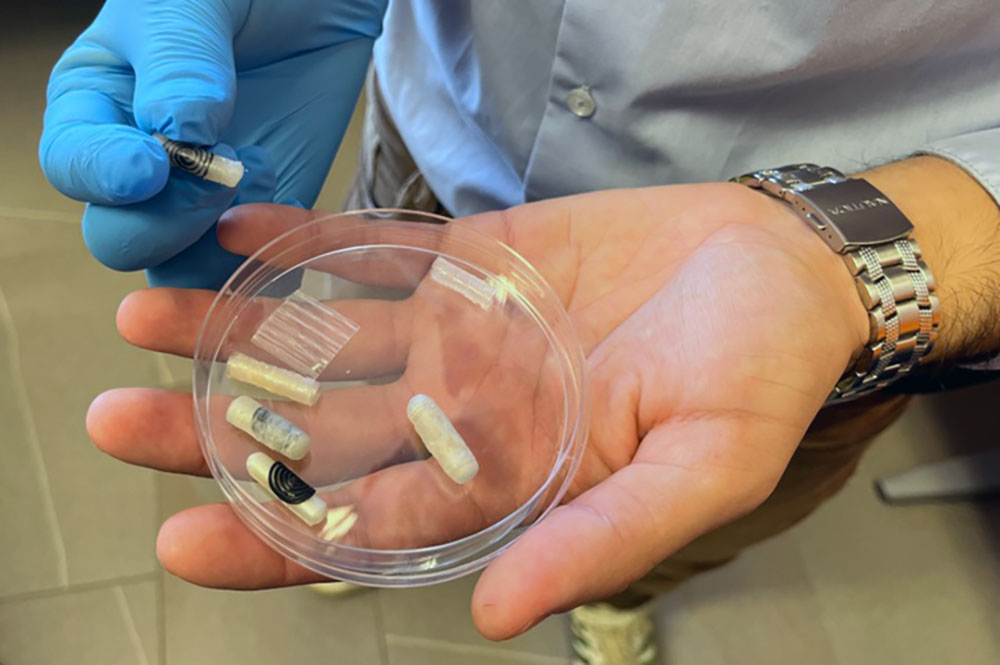 La virtù di questo dispiegamento in forma di foglio che aderisce al tessuto ko, Carmelo De Maria, docente di bioingegneria all’Università di Pisa, la spiega così: «La capsula può coprire un’area più ampia della mucosa intestinale sanguinante e favorirne la rigenerazione. La forma finale è ottenuta grazie a una specifica disposizione spaziale dei materiali, che consente alla struttura di reagire in modo controllato all’ambiente interno del corpo». Di più: «La capsula è inoltre dotata di una piccola antenna, anch’essa stampata 3D e biocompatibile, in grado di segnalarne la presenza all’interno del corpo dopo l’ingestione. Una volta che la struttura incontra l’ulcera e si dispiega, e consente una comunicazione con l’esterno, fino alla sua degradazione. Altrimenti viene espulsa regolarmente».