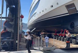 Le operazioni di sollevamento del megayacht nel cantiere Sanlorenzo