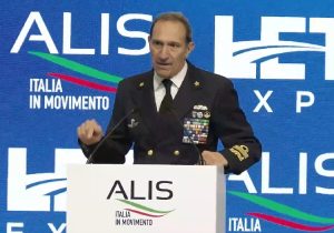 L’ammiraglio di squadra Giuseppe Berutti Bergotto, 62 anni compiuti a marzo, durante un intervento a un evento dell’associazione di logistica sostenibile Alis guidata da Guido Grimaldi
