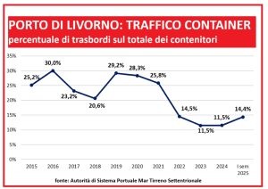 Stavolta no: il porto di Livorno torna al 14,4% di contenitori trasbordati, dopo che per due anni di fila la quota si era attestata all’11,5% (mentre sia durante il picco più grave del Covid sia nel decennio precedente si viaggiava perlopiù attorno al 25-30%). Non solo: è soprattutto “transhipment” (trasbordo) di contenitori pieni. Al netto di quest’incremento degli “scatoloni” trasbordati, l’incremento dei contenitori provenienti dal (o destinati al) sistema economico che sta alle spalle del porto di Livorno è appena al di sotto degli otto punti percentuali.
