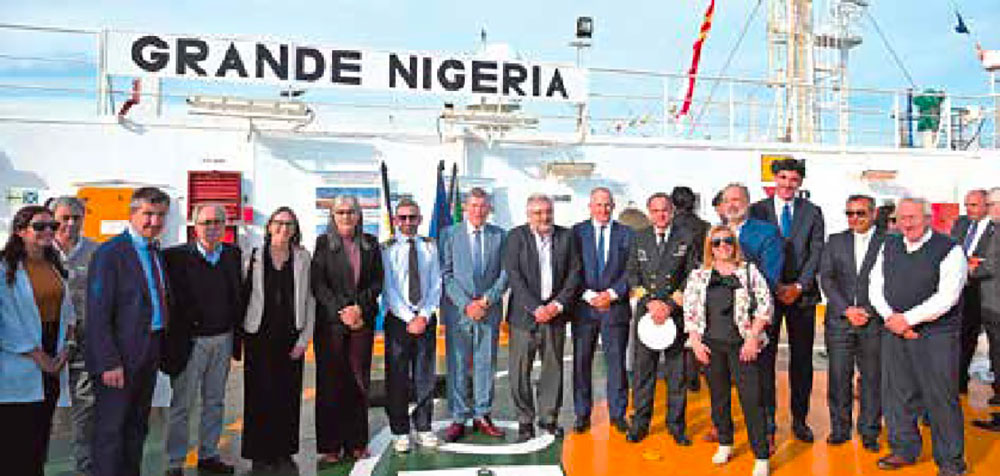 Foto di gruppo davanti alla nave Grande Nigeria a Montevideo